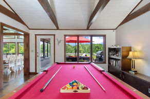 Upstairs is a large open plan living space of kitchen, tv room, sun-room, dining room and pool room.